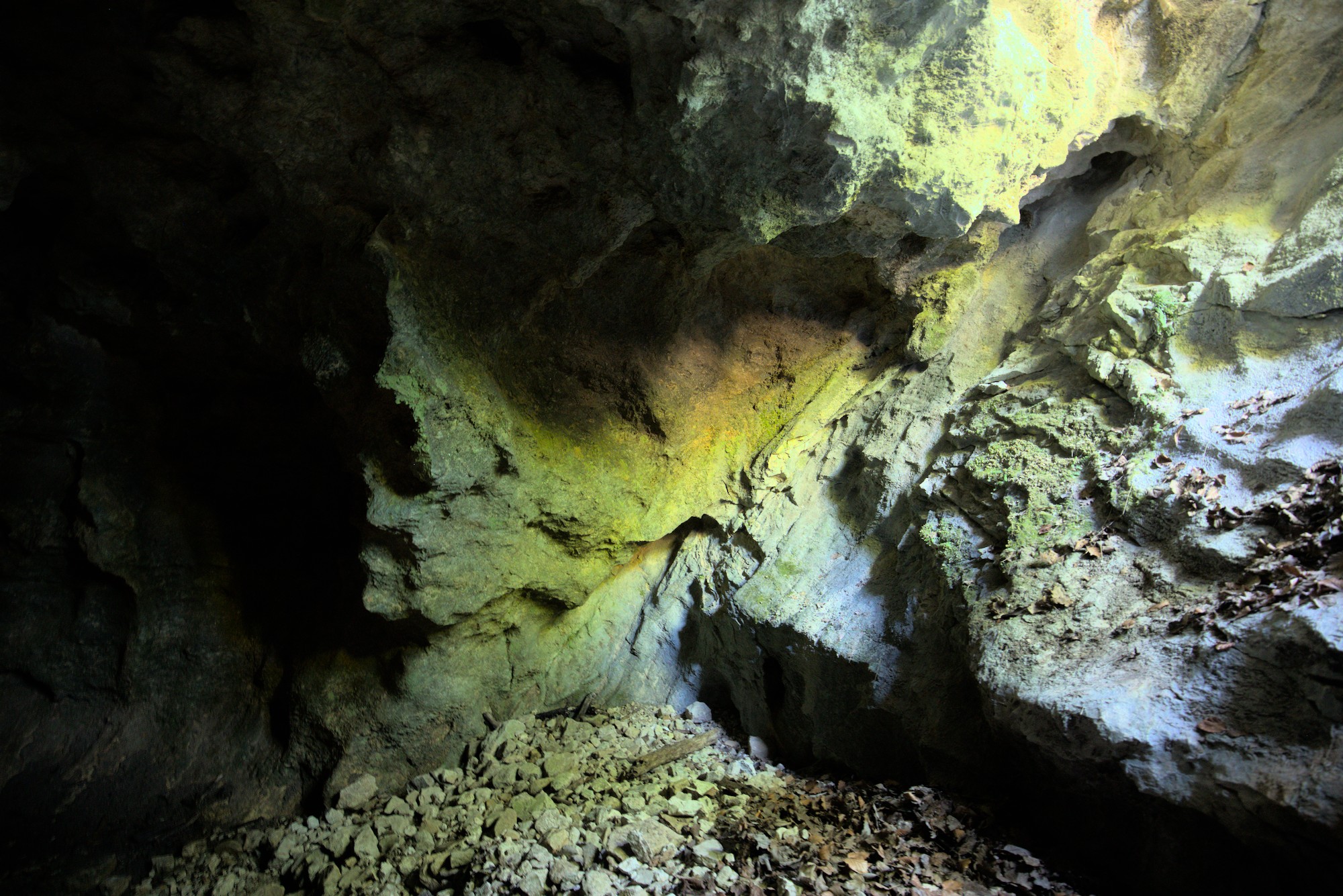 Vue intérieur de la grotte, la sortie sur la droite et le fond sur la gauche.