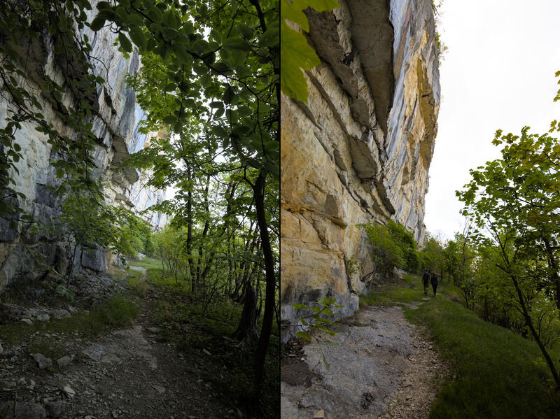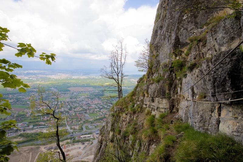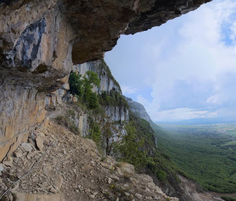 La première partie du sentier est en fait la vire du Canapé. En montant depuis le Pas de l’Échelle, juste après le dernier escalier vous arrivez devant un tunnel de l’ancien train à crémaillère. Vous pouvez rejoindre la vire du Canapé en montant sur la droite du tunnel, ou alors en venant depuis l’église de Monnetier, tout est indiqué sur les cartes actuelles.