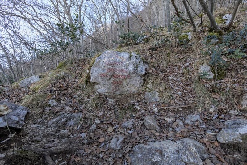 Depuis le sentier de la Grande Gorge, au lacet le plus à gauche de la montée, des marques sur une pierre indiquent la Petite Gorge.