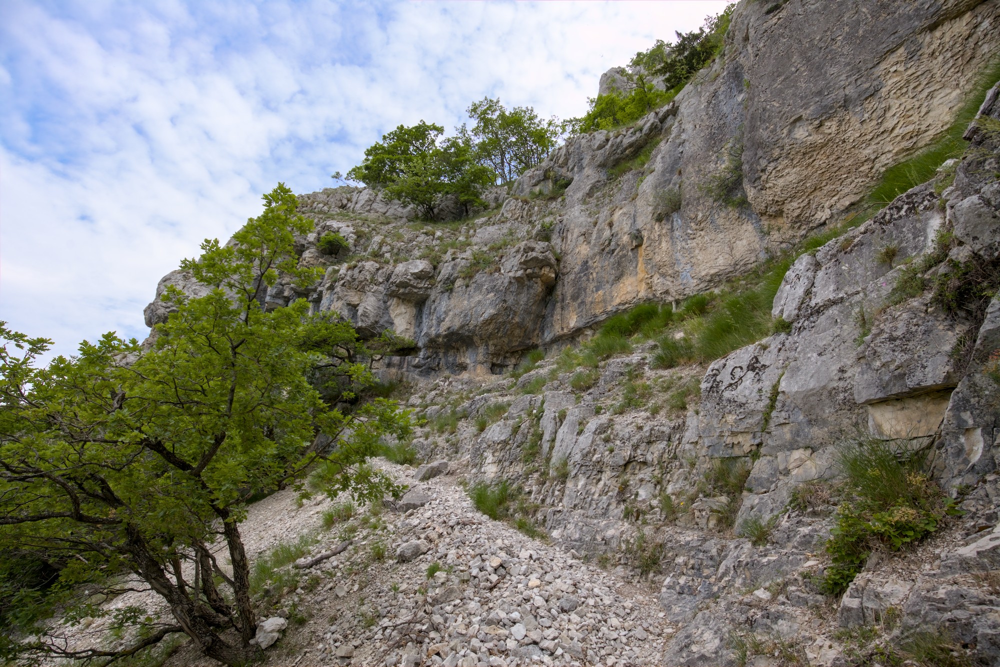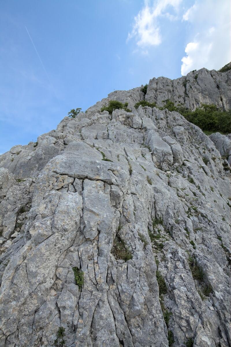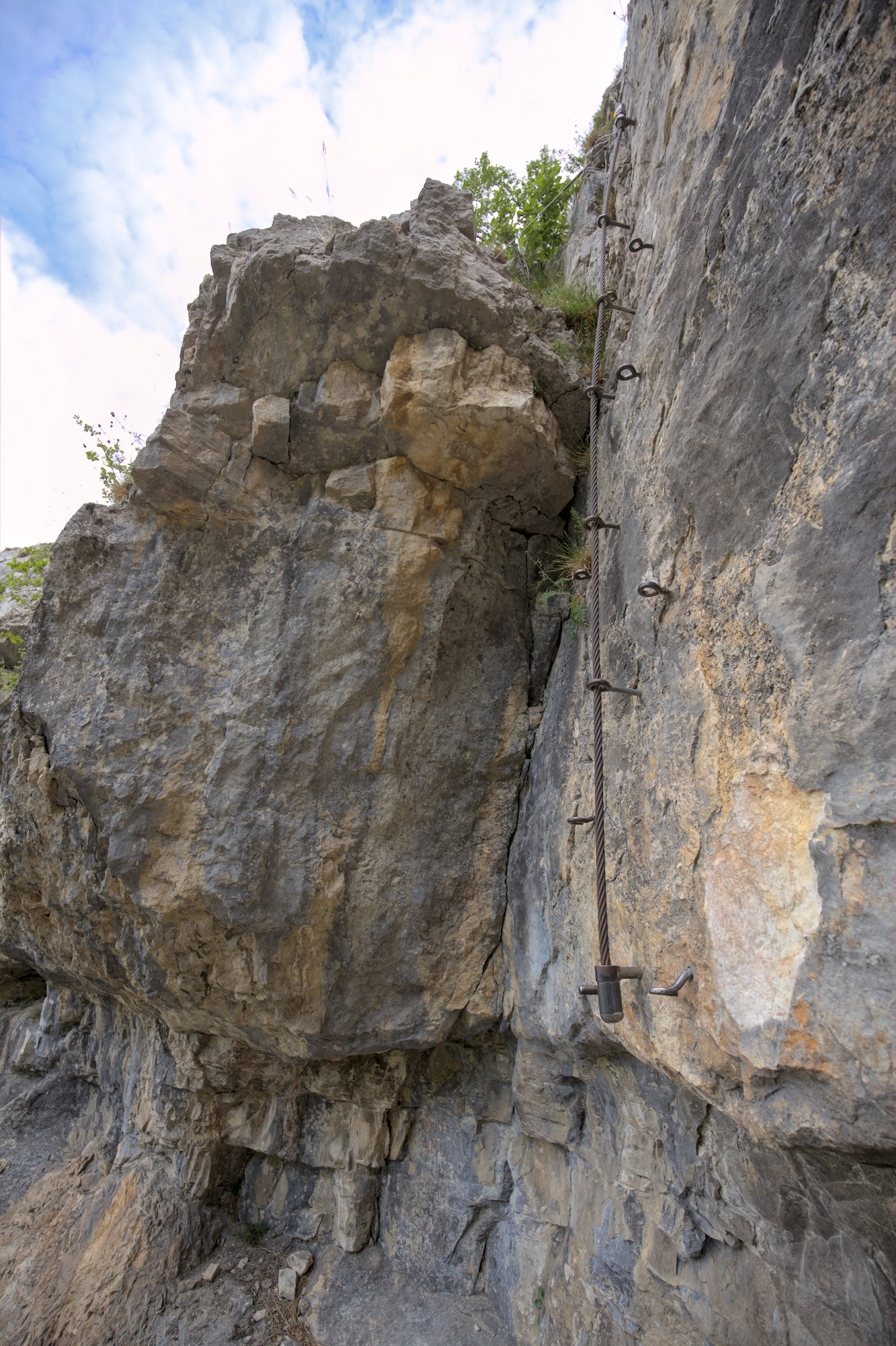 La sente nous amène sous une falaise dont la première partie s’escalade aisément. En suivant sur la droite, vous atteindrez une chaine qui aide l’ascension. Il est également possible de grimper plus traditionnellement par le renfoncement qui précède la chaine.