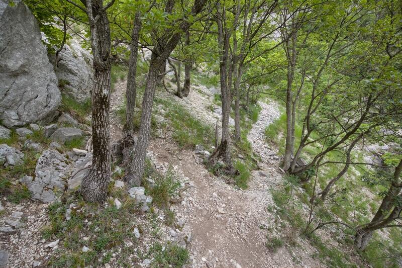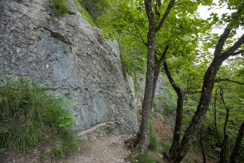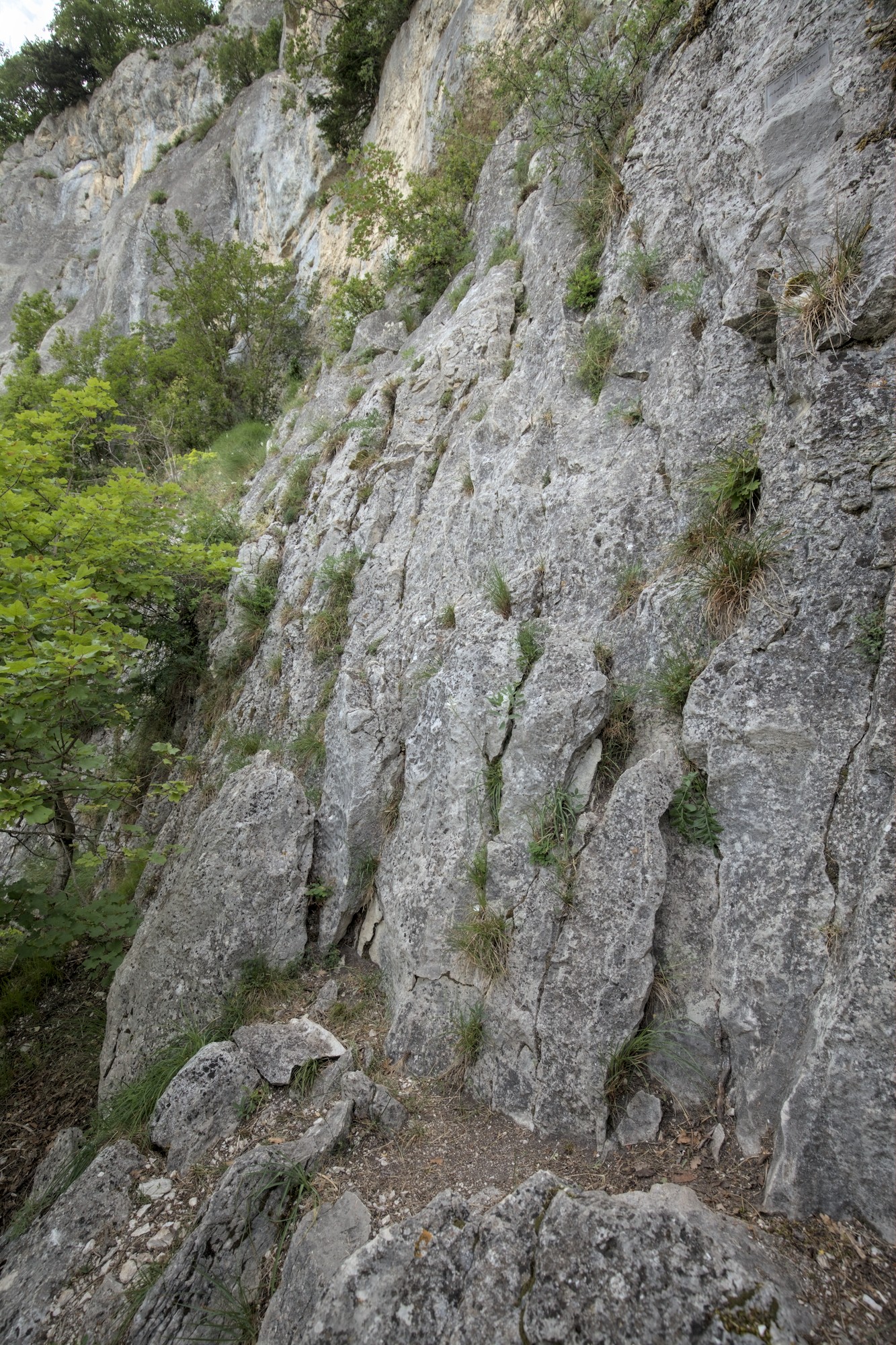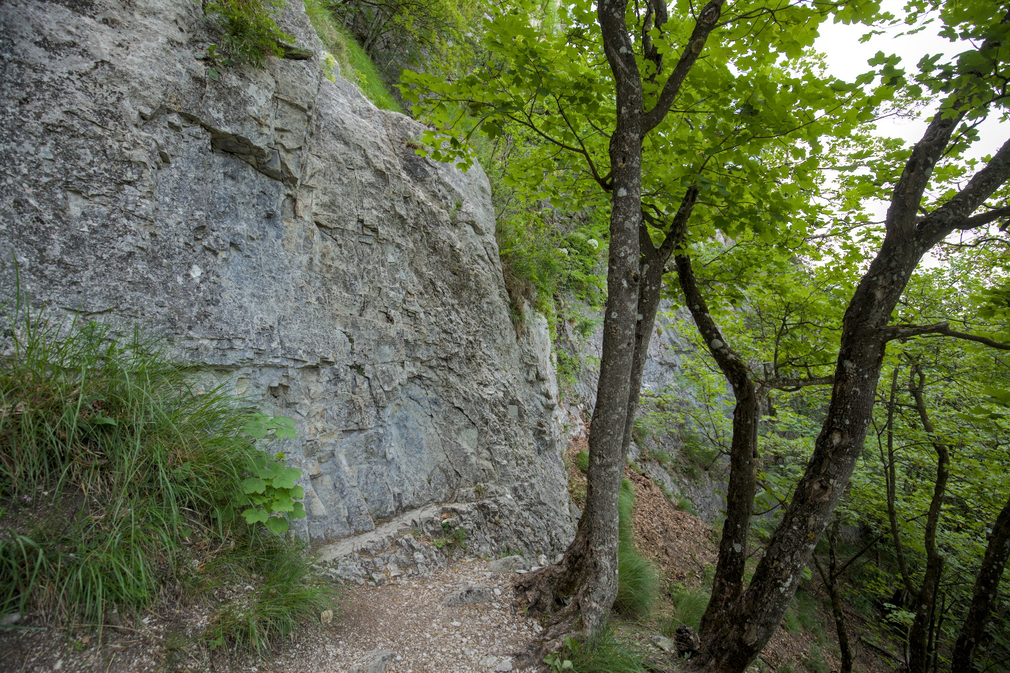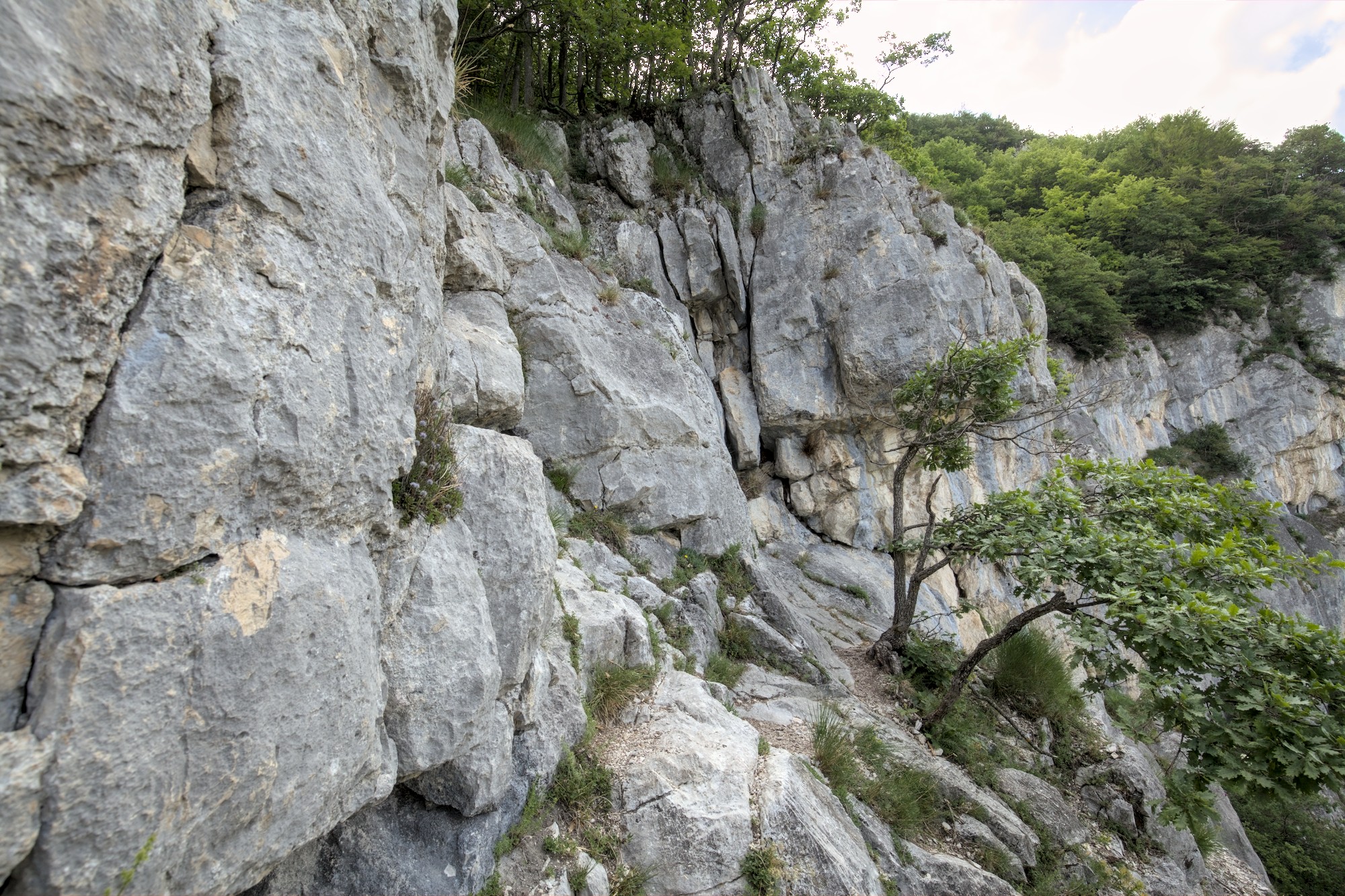 La sente nous amène sous une falaise dont la première partie s’escalade aisément. En suivant sur la droite, vous atteindrez une chaine qui aide l’ascension. Il est également possible de grimper plus traditionnellement par le renfoncement qui précède la chaine.