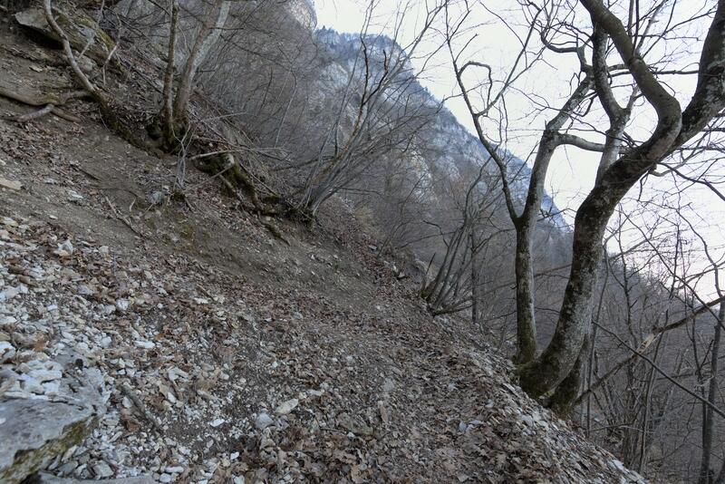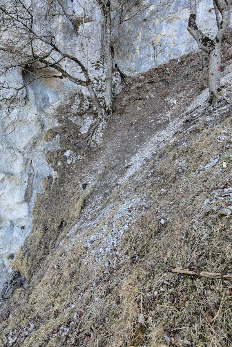 Juste avant le Trou du Chat, il est possible de longer la pente à l’horizontal jusqu’à l’arbre marqué et de rejoindre le trou à l’aide d’une corde, ce choix est moins périlleux que de suivre la sente dans un dévers glissant.