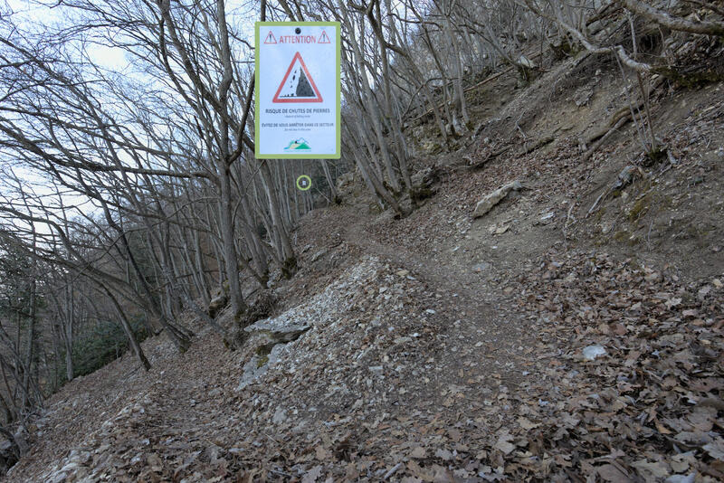 D’ici monter environ 50m puis prendre la ravine qui remonte vers la droite en direction de ce panneau.