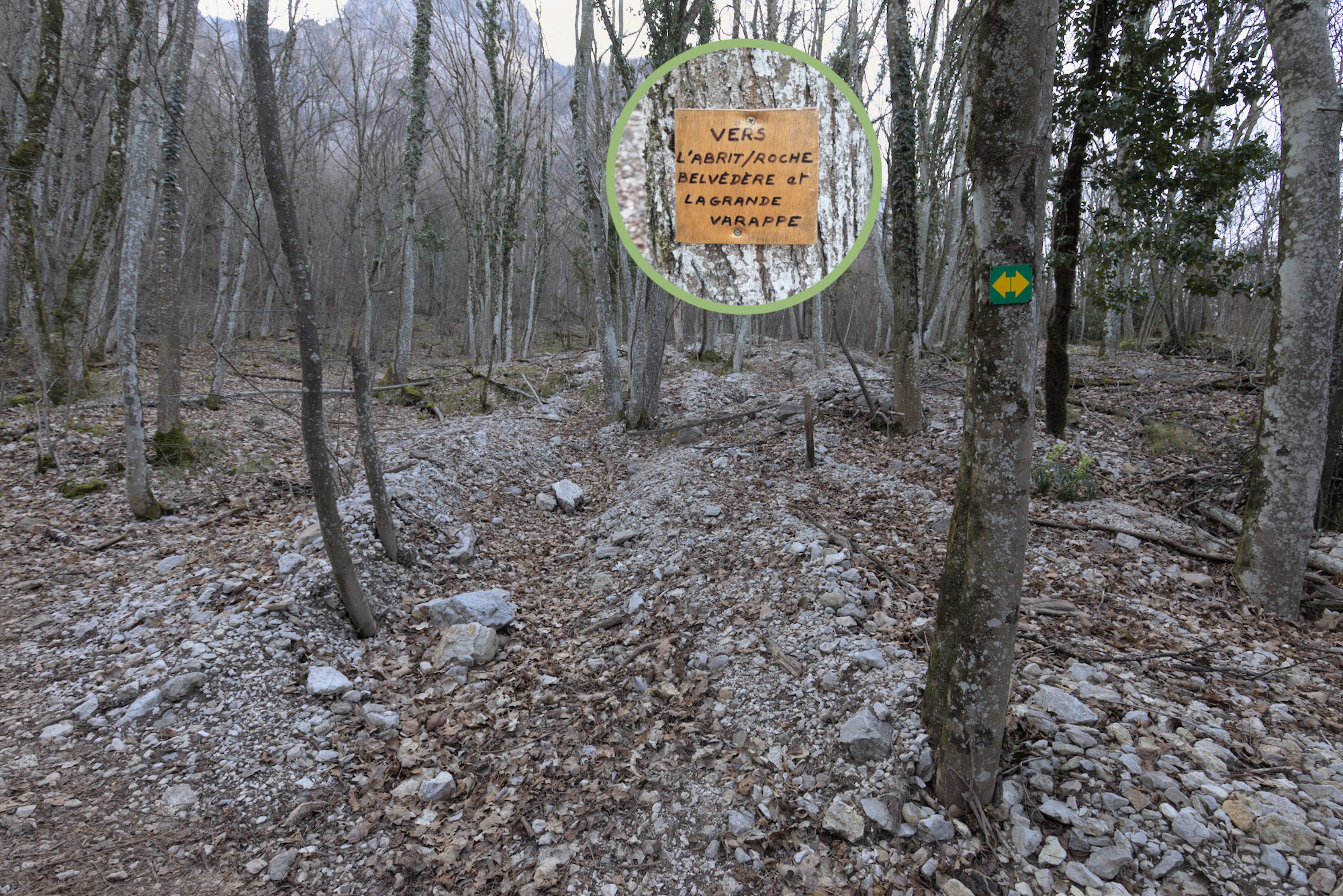 Il faut d’abord emprunter le sentier de la Grande Gorge jusqu’à environ 750 m, au dernier lacet côté droite, Le Reposoir, avant que le sentier ne commence une longue traversée sur la gauche.