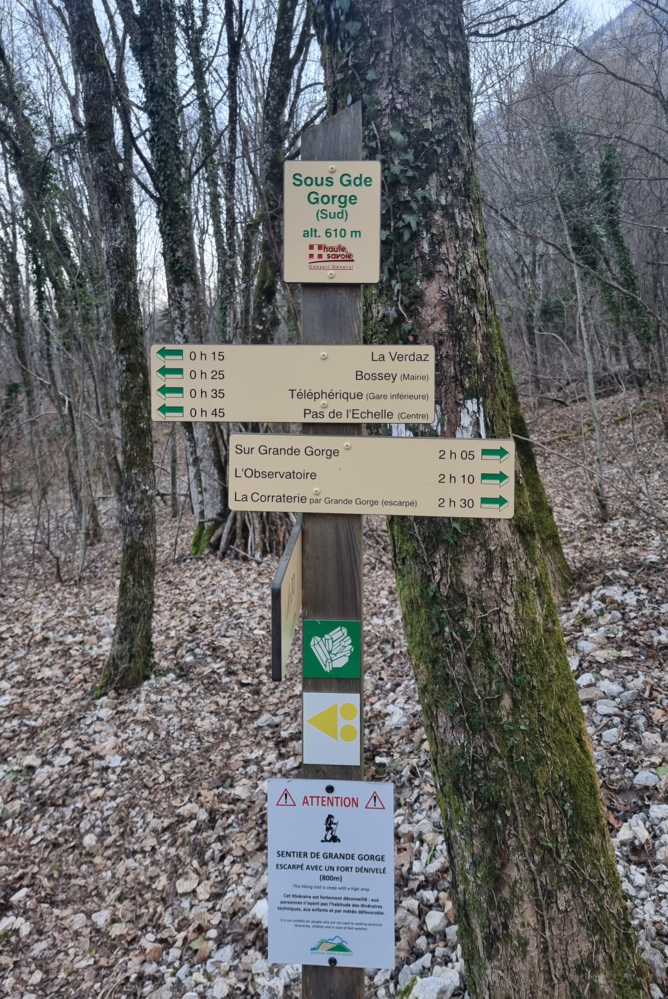 Un des sentiers les plus sauvages du Salève. On passe ici par la Grotte Julliard, le Rocher de la Poupée, le Trou du Chat, le Pas du Singe et on a des points de vue magnifiques sur le fond de la Grande Gorge, impossible d’apprécier un tel panorama depuis le sentier balisé et entretenu du même nom. Toutefois, sans être vraiment difficile, ce sentier est raide, glissant, exposé, il y a des petits pas d’escalade facile et, bien qu’il soit balisé en rouge du début à la fin, il est nécessaire de bien lever les yeux faute de perdre la trace.