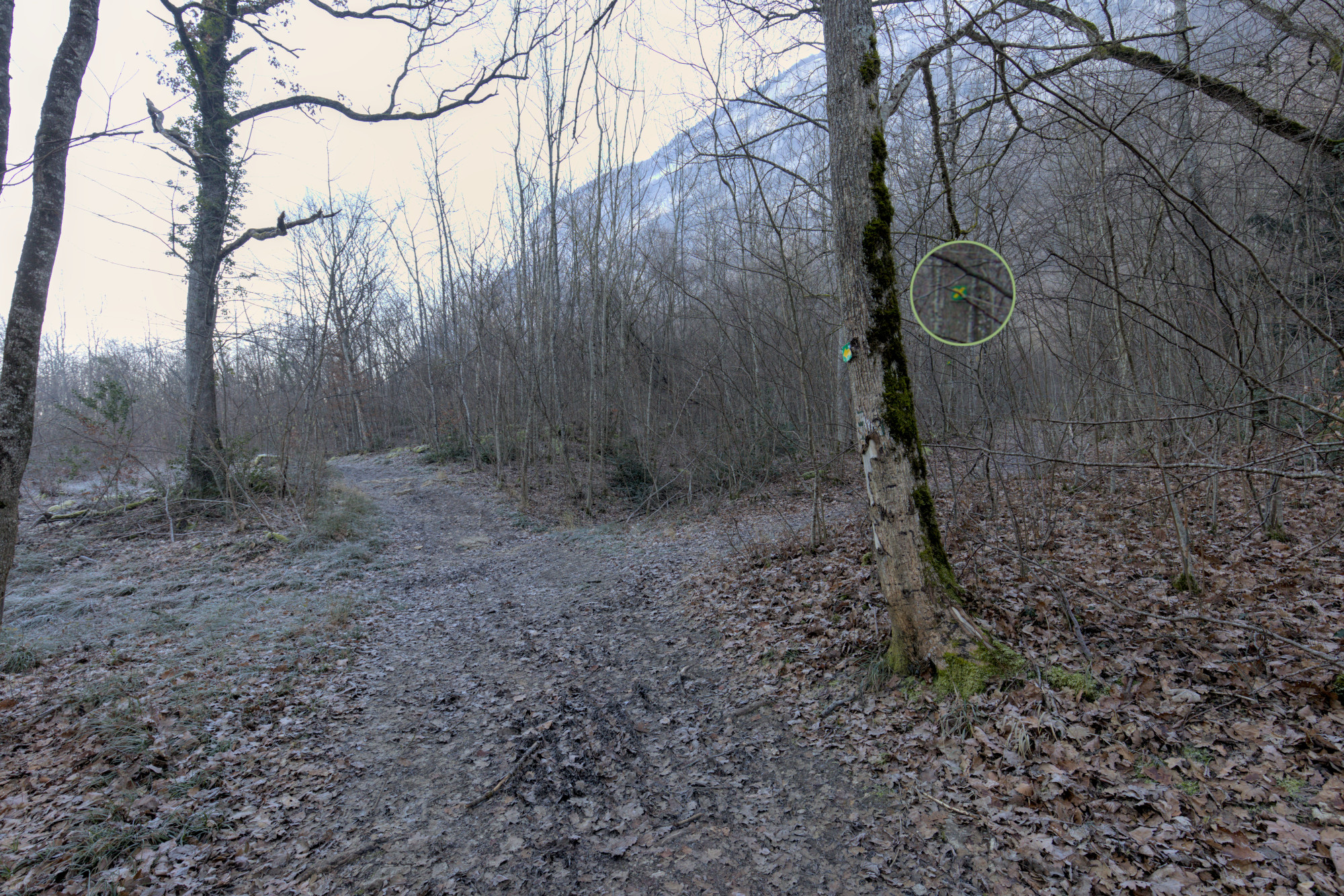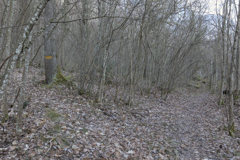 Le début du sentier est indiqué par deux panneaux verts, comme montré sur la photo. Il y a ensuite une deuxième bifurcation qui ressemble à la première mais qui est cette fois indiquée par un numéro “9” sur un arbre, et une marque jaune sur l’autre côté de ce même arbre.