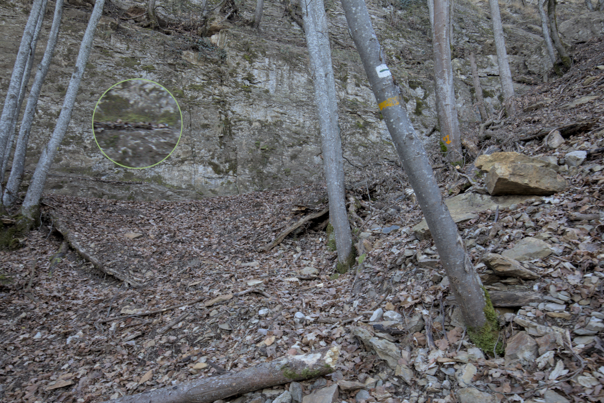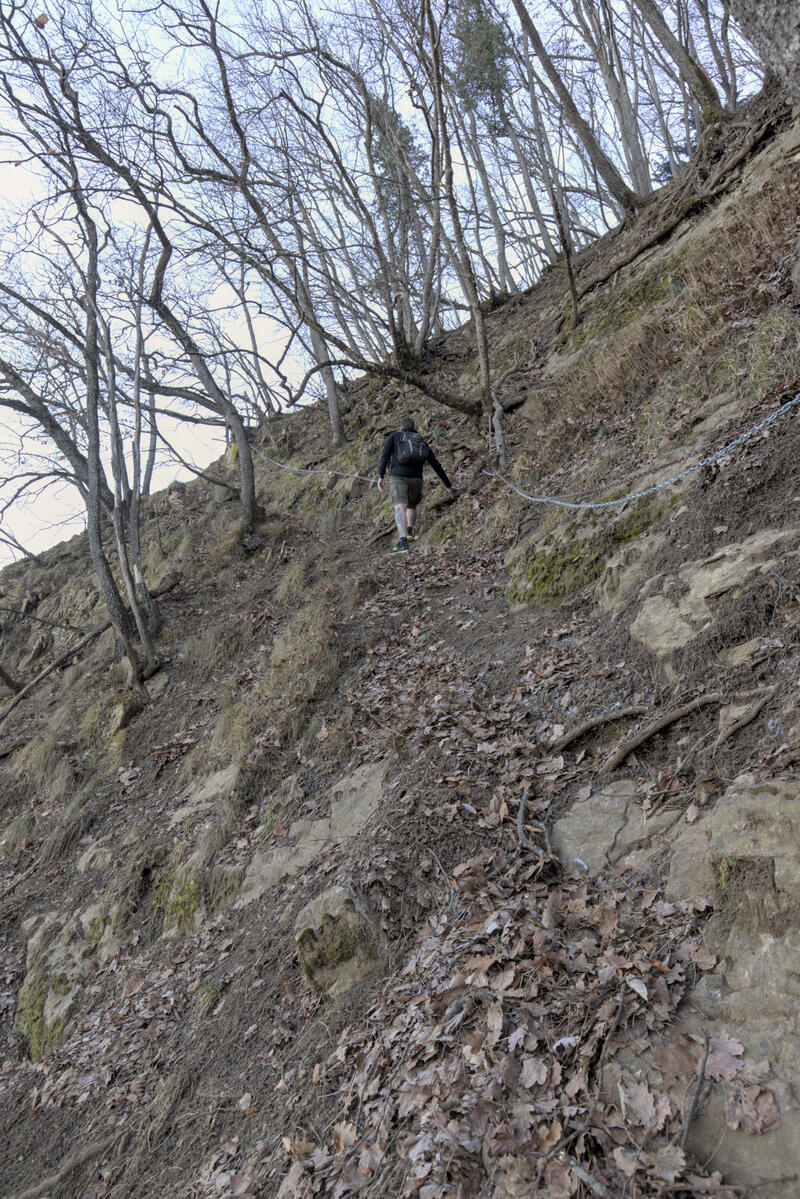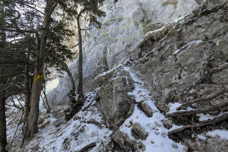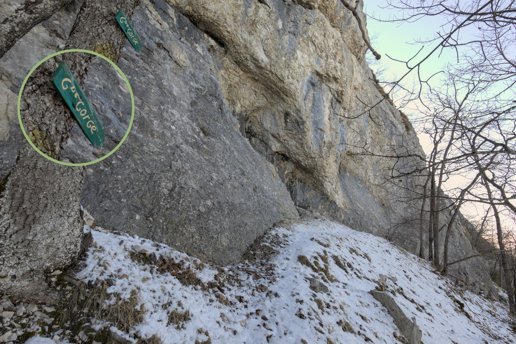 Quand vous êtes arrivé à cette paroi, avez repéré la marque jaune et la chaîne partant à gauche, vous avez fait le plus dur de ce sentier… en ce qui concerne l’orientation. Cette photo a été prise en janvier, mais suivant la saison, repérer ces marques peut prendre un certain temps. Si ça ne vous prend pas un certain temps, c’est qu’on a été clair et on vous en prie.