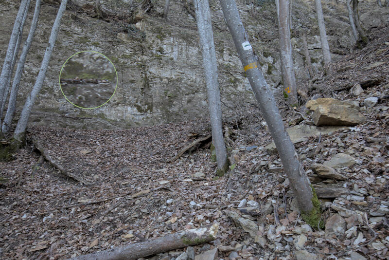 La chaîne, bien que peu visible sur la photo (la zone mise en évidence), sera immanquable une fois la paroi rejointe.