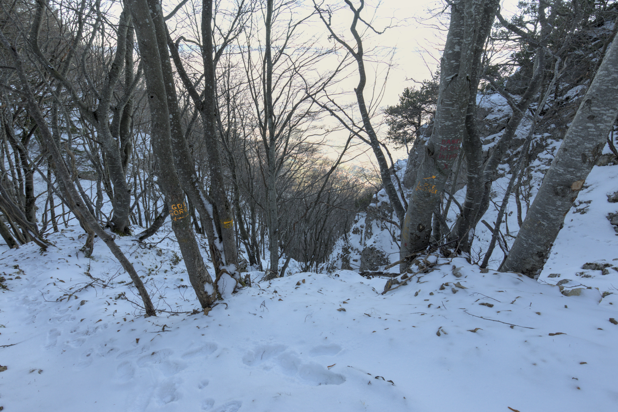 On reprend ensuite une section à nouveau assez raide, finissant dans une sorte de goulet qui mène à une nouvelle intersection (marques sur les arbres, mais à revers).