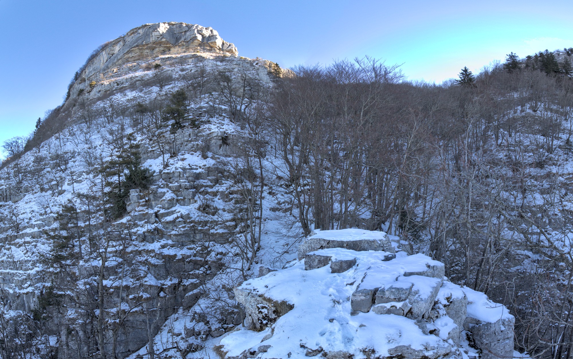À droite (pas à revers, dans le sens de marche1), le sentier du Solitaire mène au Rocher de 11 heures, magnifique point de vue sur le sentier de la Grande Gorge. À gauche, on rejoint la fin du sentier des Buis et on arrive (relativement) rapidement au sommet (encore 120 m D+), sous l’antenne TV et radio du Salève.