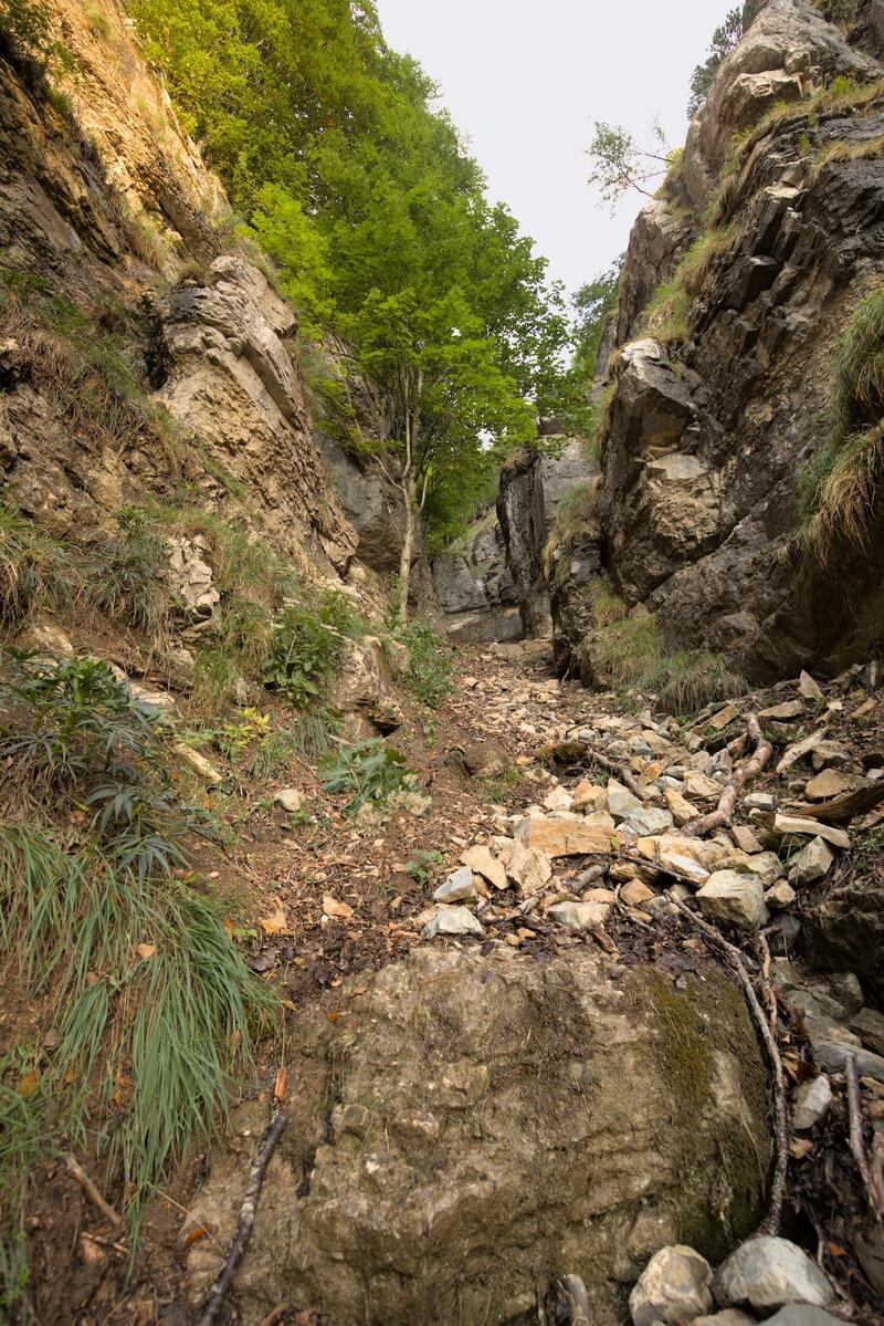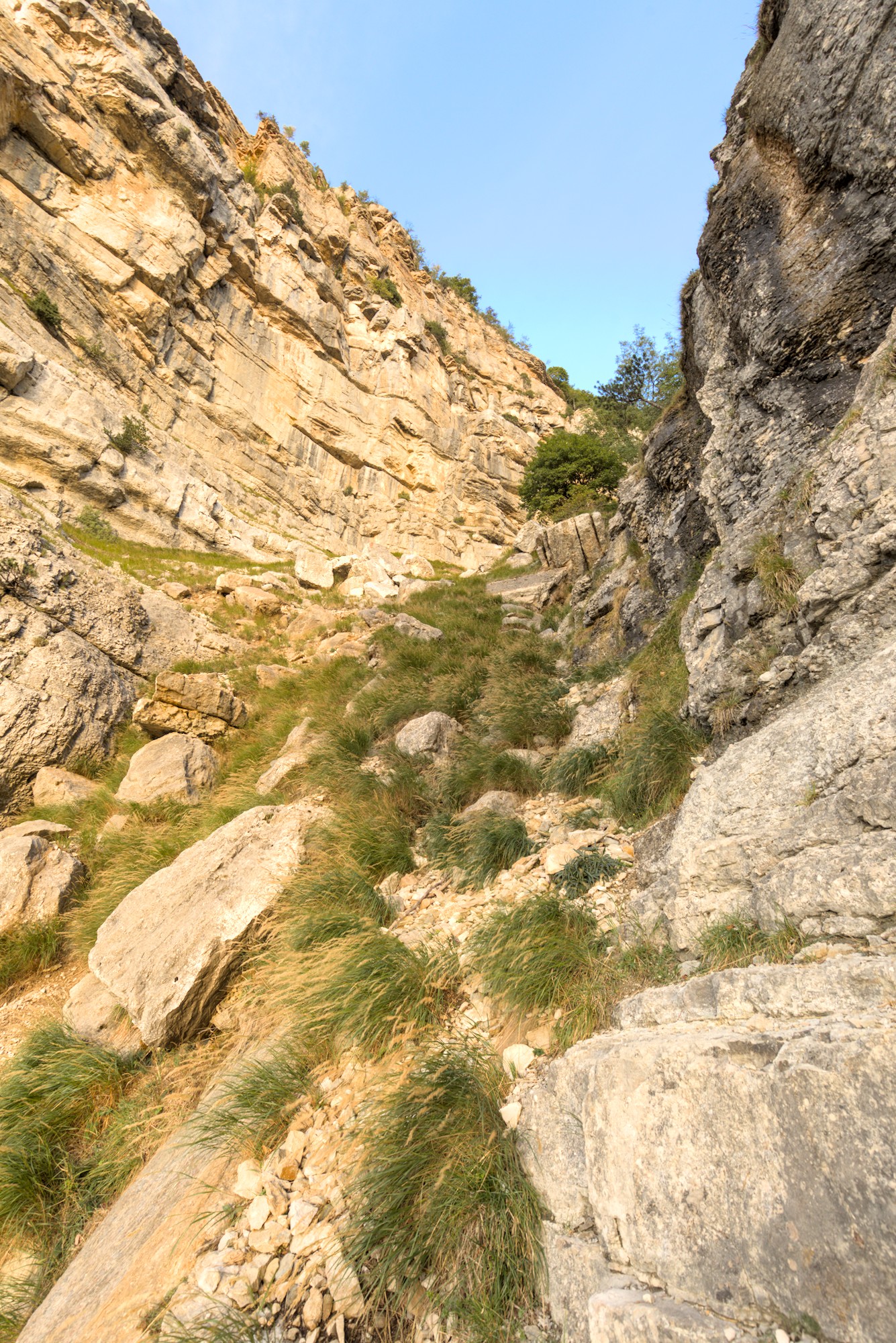 Il est possible de monter dans l’herbe, sur la gauche de la gorge6, ou en plein milieu dans les rochers, à adapter selon le niveau d’humidité, et donc d’accroche, du sol.