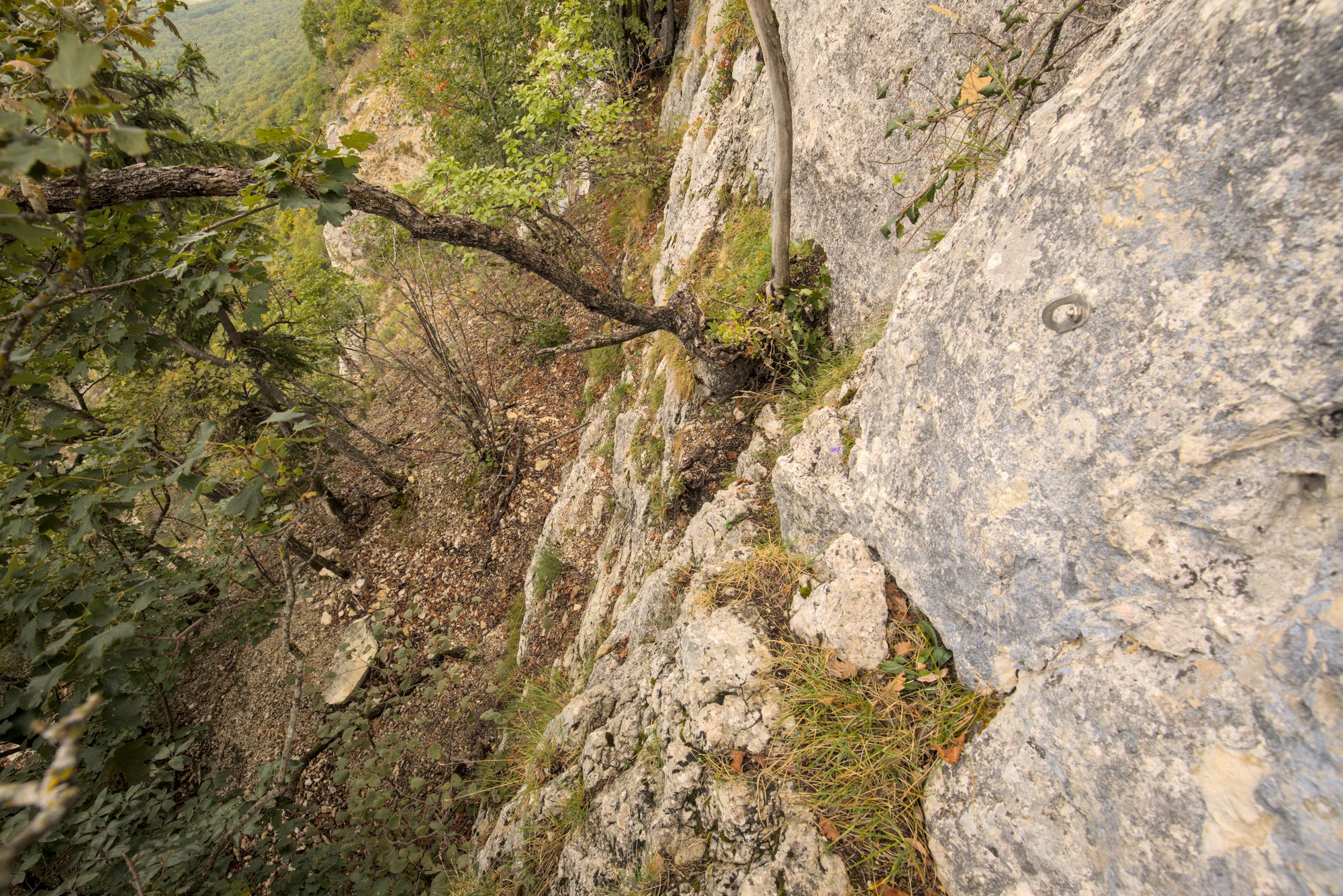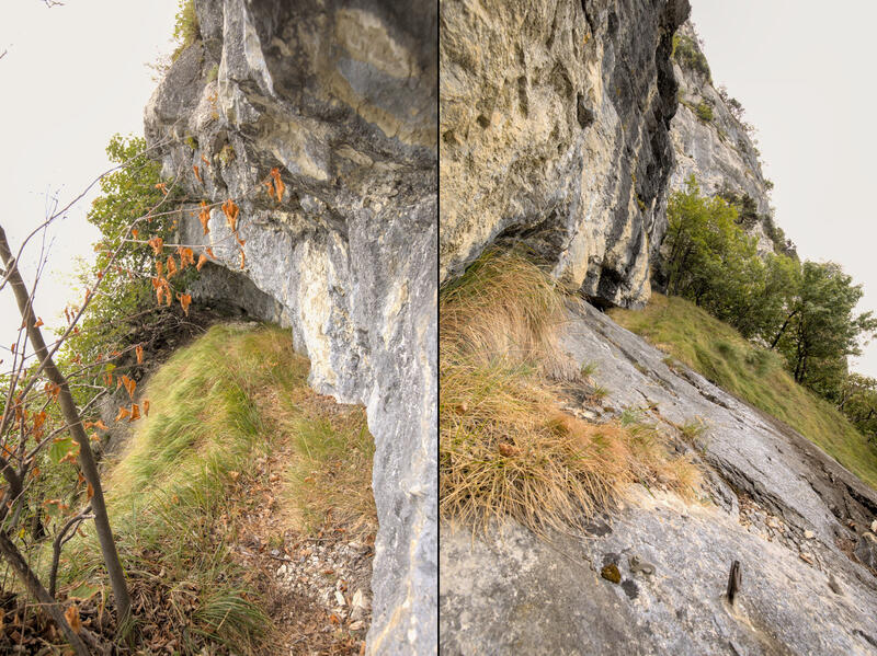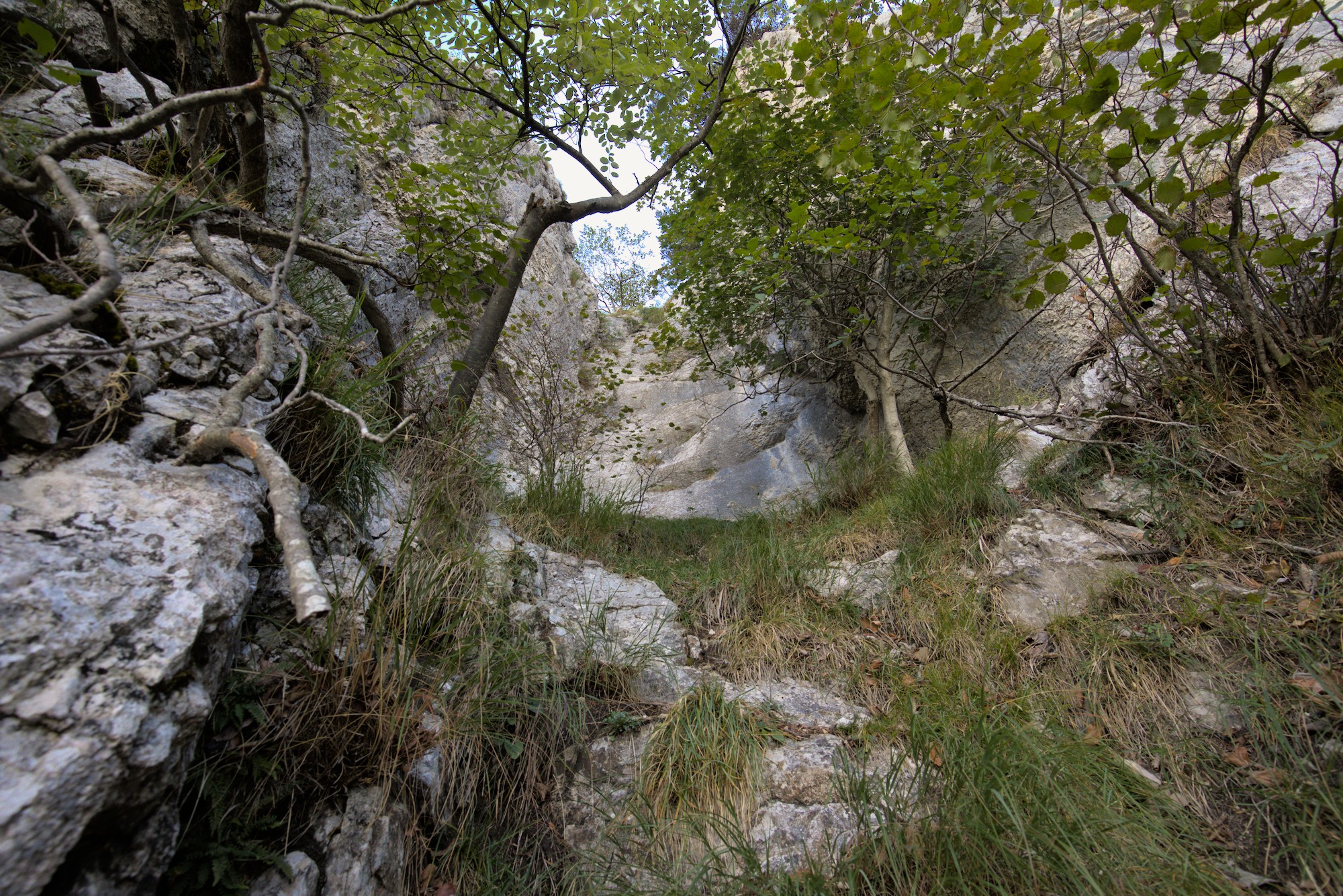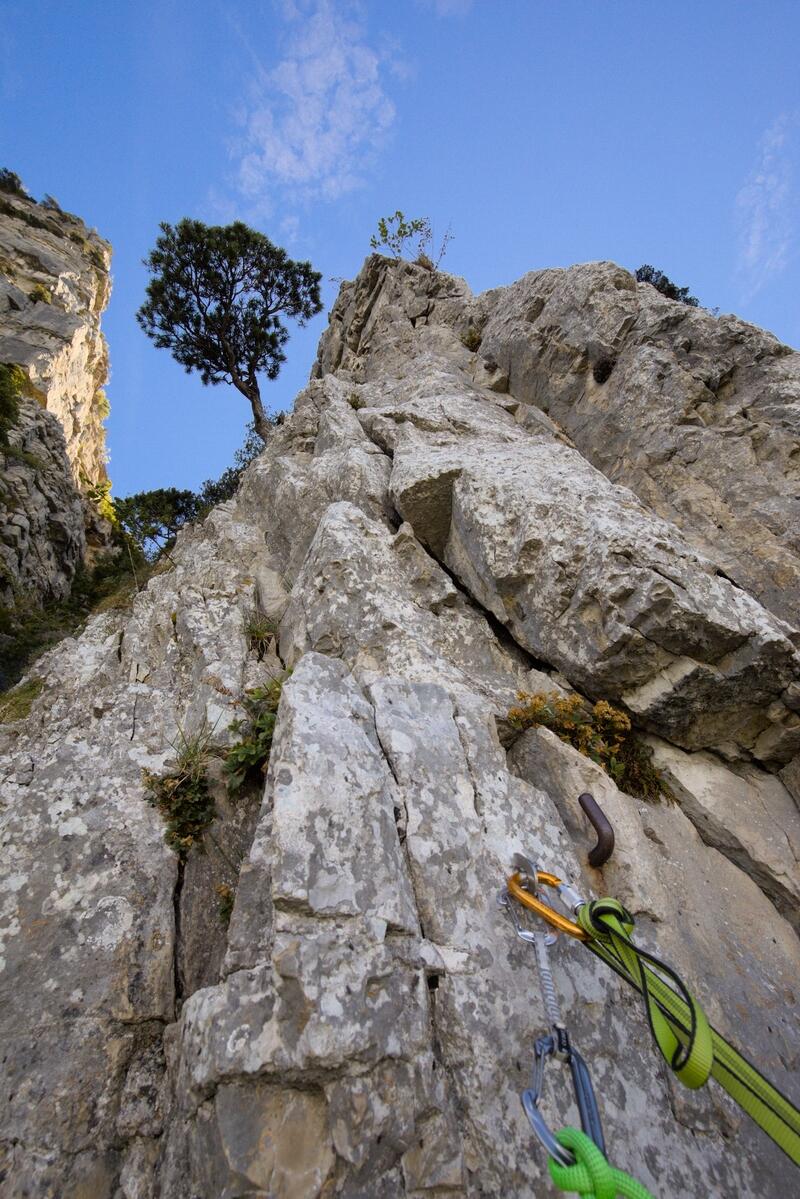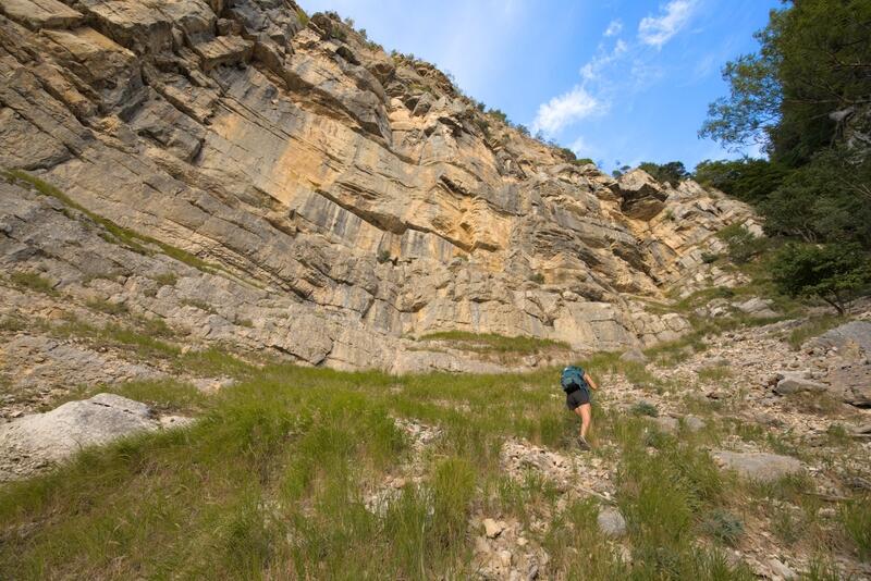 Le sentier croise ensuite une petite ravine où il faudra descendre et remonter quelques mètres. S’en suit une jolie dalle inclinée. Par temps sec, cette dernière ne devrait pas poser de problèmes, et dans le cas où la confiance vous quitterait, il est possible de s’y assurer avec un spit à son début, une vieille tige au milieu et un relai constitué d’un spit et d’un vieux point à la fin. Profitez ensuite du petit passage sous une jolie voute avant d’arriver à la partie technique de l’ascension.