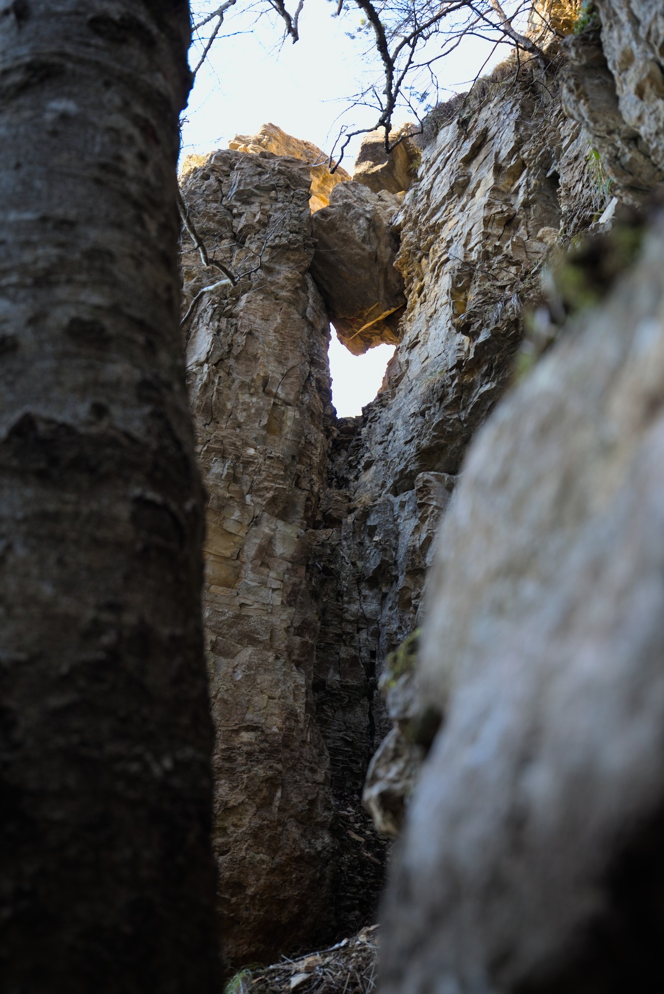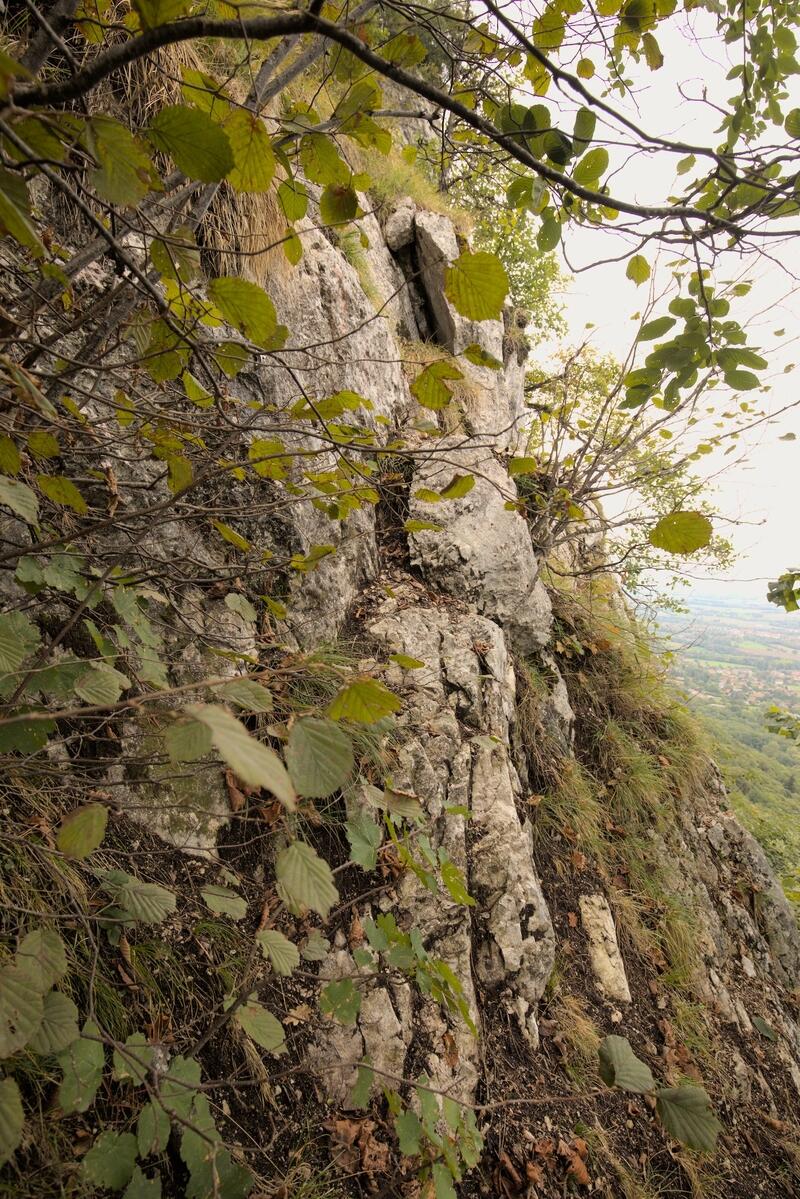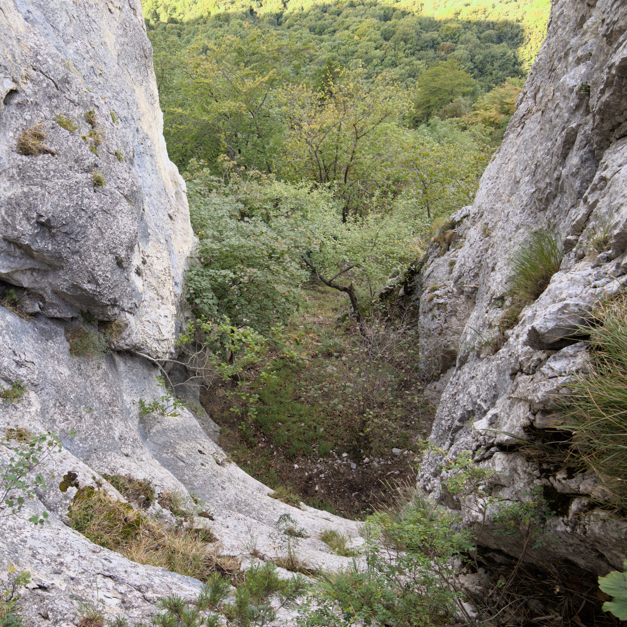 Le sentier croise ensuite une petite ravine où il faudra descendre et remonter quelques mètres. S’en suit une jolie dalle inclinée. Par temps sec, cette dernière ne devrait pas poser de problèmes, et dans le cas où la confiance vous quitterait, il est possible de s’y assurer avec un spit à son début, une vieille tige au milieu et un relai constitué d’un spit et d’un vieux point à la fin. Profitez ensuite du petit passage sous une jolie voute avant d’arriver à la partie technique de l’ascension.