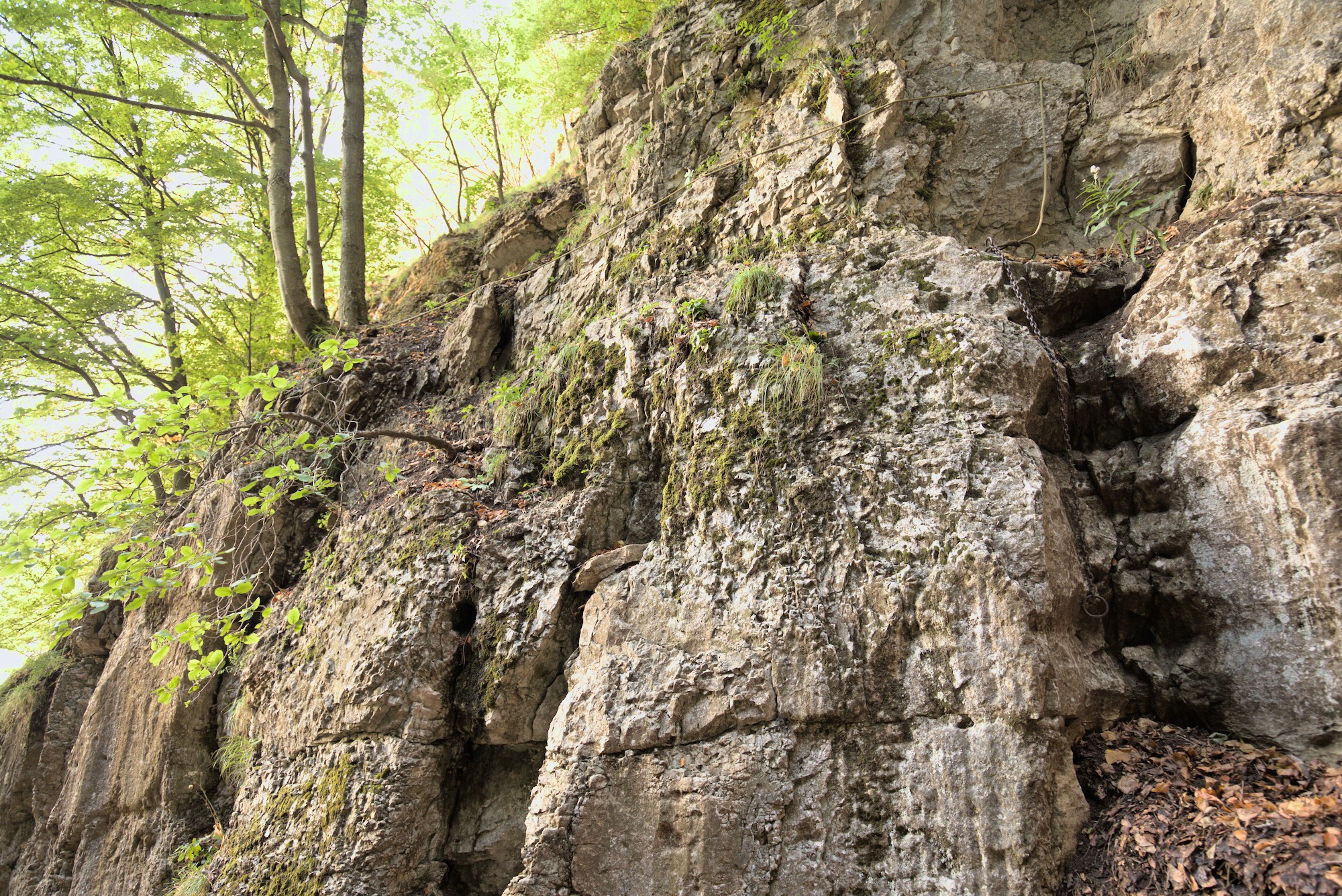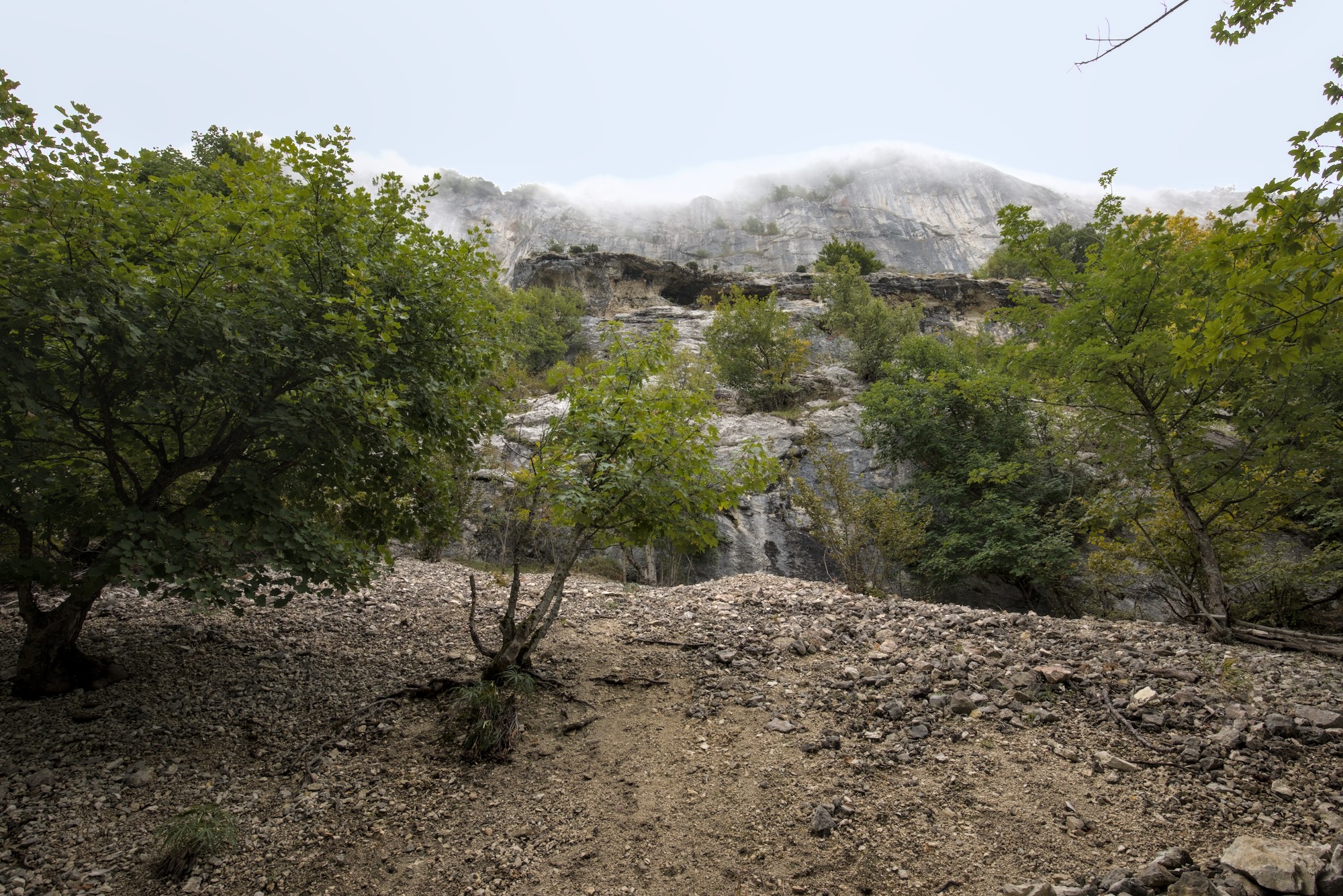 Le chemin forestier est bien visible. Au premier replat, il faudra suivre le sentier de droite qui commence à plat puis monte dans un pierrier jusqu’à une belle paroi rocheuse. Vous pouvez ici partir à main droite vers la grotte des Sablons, ou suivre le sentier en restant sur la gauche.