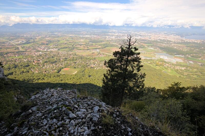 Après un bref, mais raide, passage dans la forêt, le sentier rejoint un pierrier et débouche sur une petite crête qui offre un superbe point de vue sur la plaine genevoise.