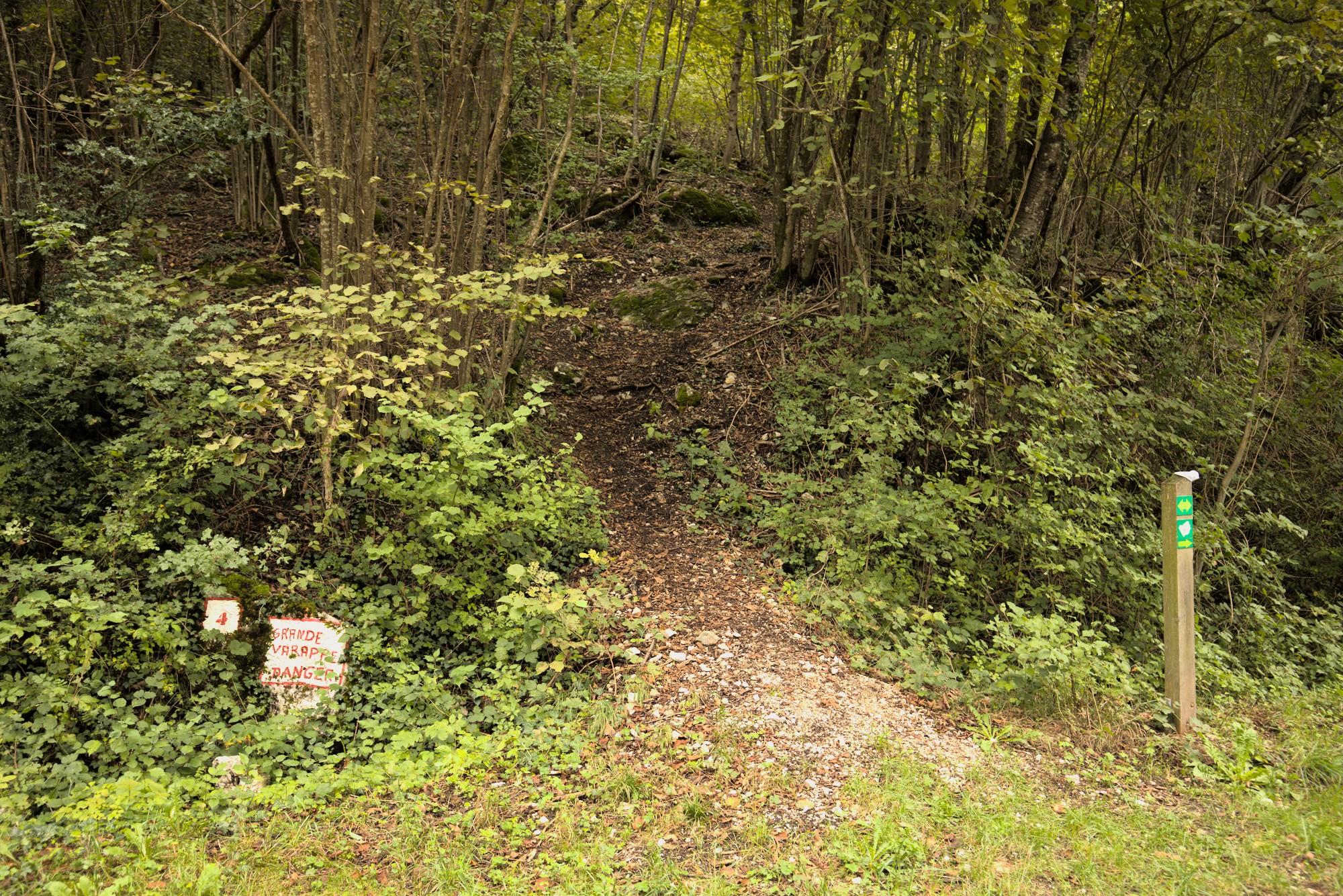 Le départ du sentier est sur le chemin qui relie le parking du Tennis Club de Collonges-sous-Salève (ou celui de l’aire de loisir du Pérouzet) et le départ de la Grande Gorge. Sur ce joli et large sentier de graviers, une marque sur la bordure des taillis permet de trouver le début de l’itinéraire.