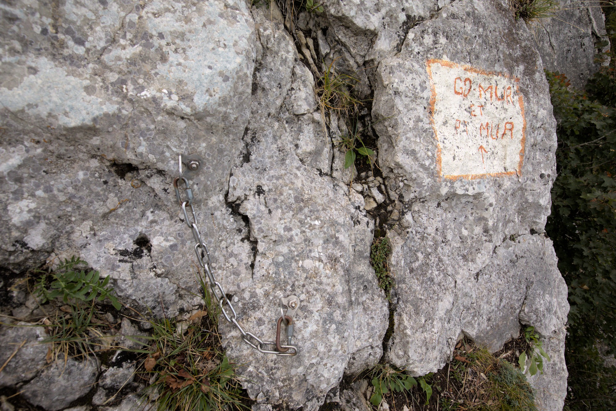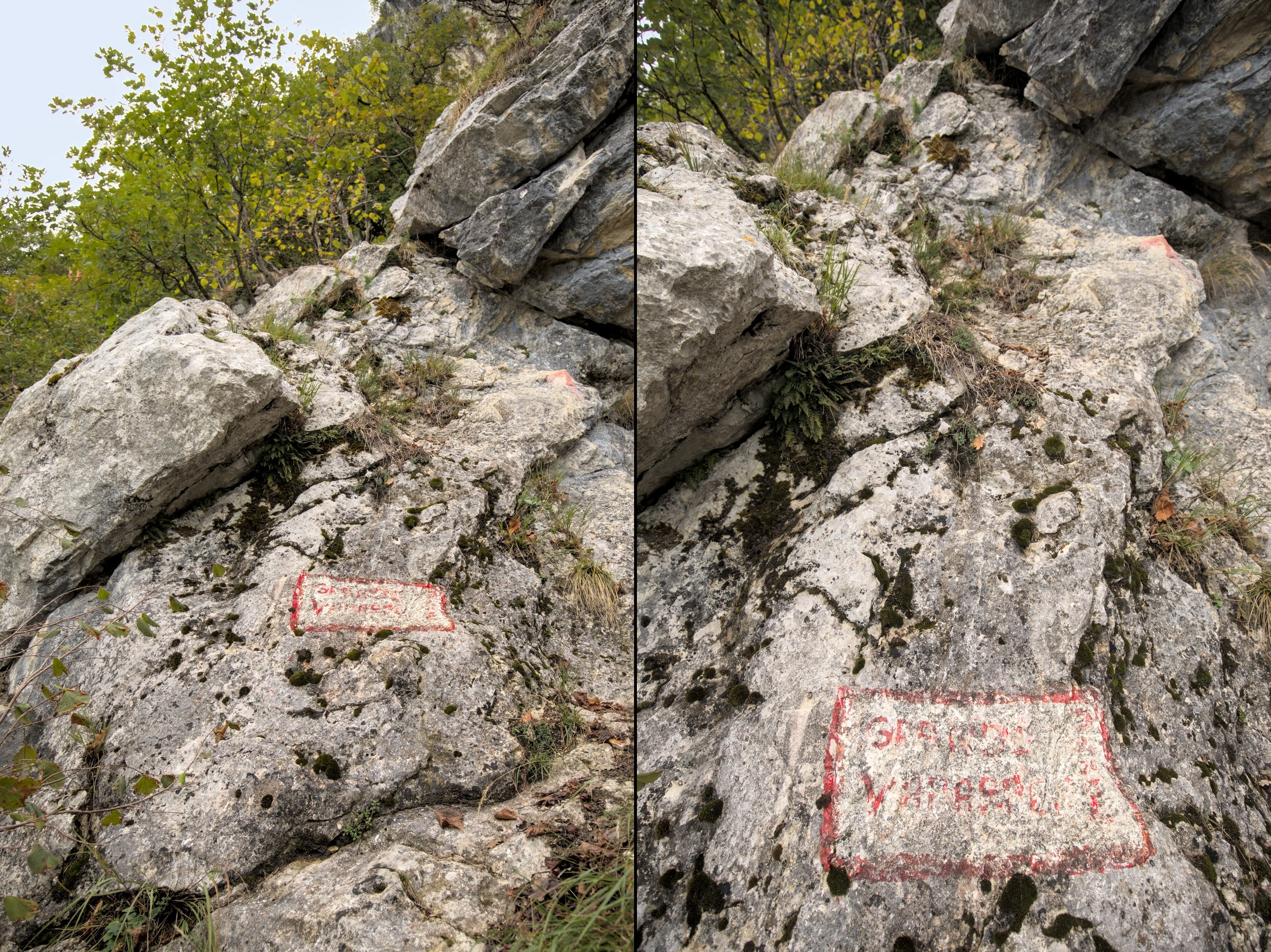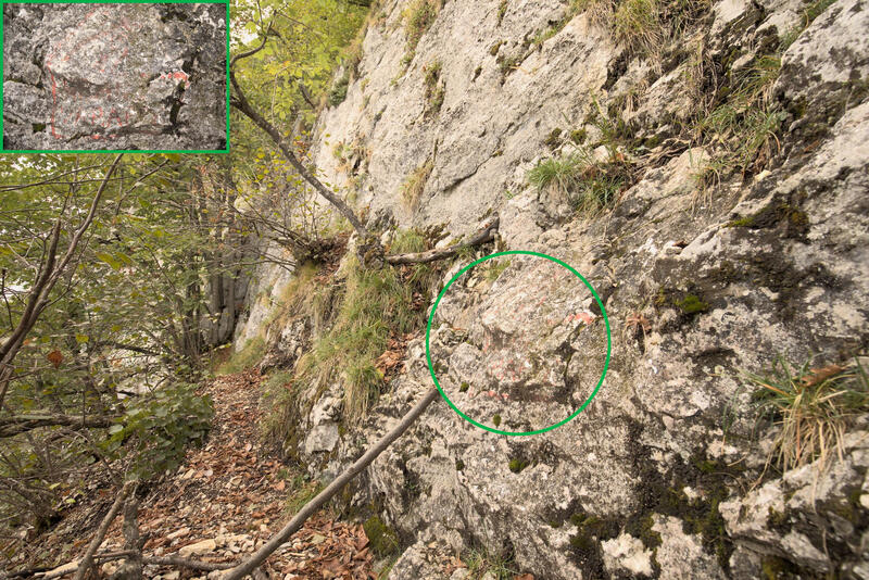 Ce premier court pas (II) permet de rejoindre la paroi supérieure et de la longer. Vous passez devant la grotte du Seillon et ses deux entrées. Le sentier longe la paroi rocheuse, faites bien attention à ne pas redescendre et à le suivre jusqu’à une inscription fortement effacée.