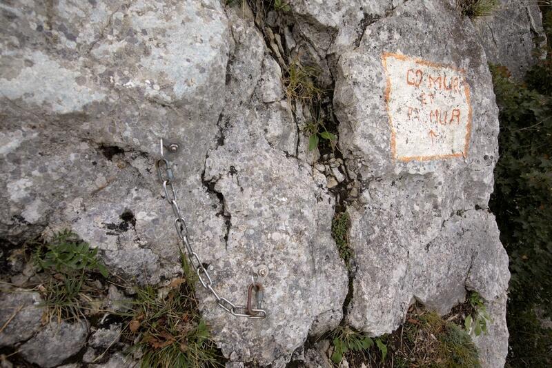 En longeant la paroi, vous passez devant la grotte de l’Ours, grimpez un petit passage raide, et buttez contre une paroi et un grand marquage Grande Varappe. C’est à cet endroit qu’il faut s’équiper, la corde n’est pas nécessaire tout de suite mais mettre son baudrier et son casque ici n’est pas une bêtise. Le sentier sera dorénavant plus technique, si vous avez rencontré des difficultés avec la première partie, vous pouvez faire demi-tour et aller profiter d’un sentier plus accessible.